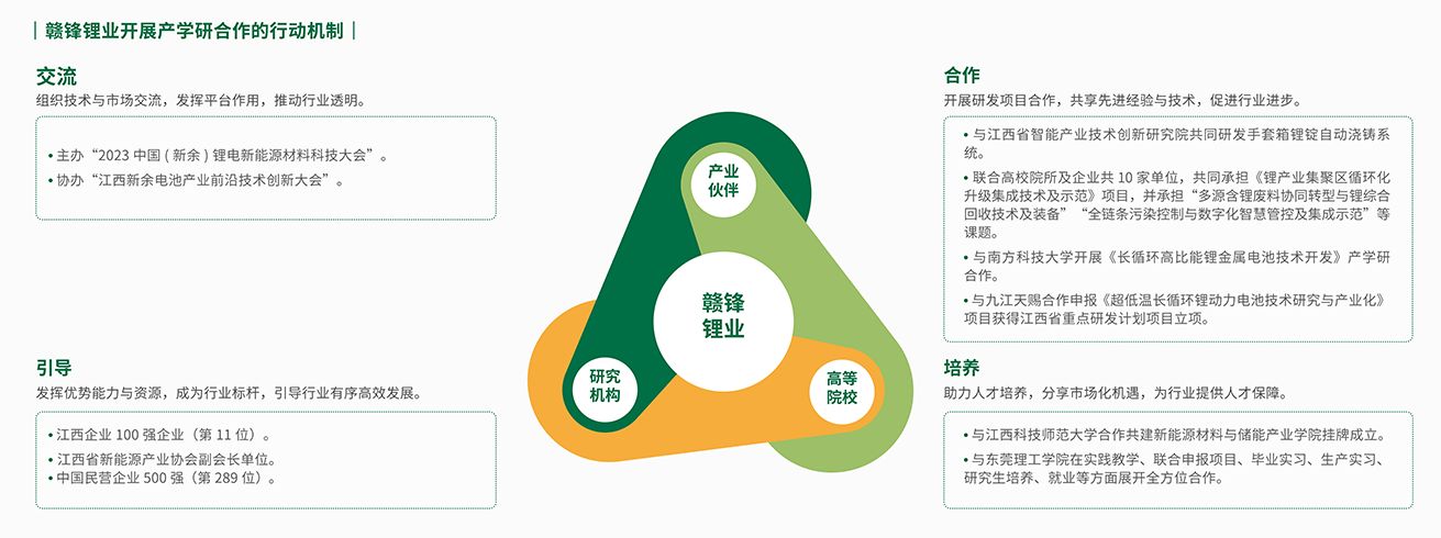 贛鋒鋰業秉持“開放、合作、共贏”理念,積極參與行業技術合作,充分發揮自身先進技術優勢,與產業伙伴、研究機構、高等院校開展技術交流與指導、合作研發、人才培養項目,帶動行業全面升級,通過共建科研機構、共同承擔國家(省級)重大科技項目、聯合開展技術攻關等形式,大幅提升企業科技創新能力,并榮獲“江西省對外合作基地與引智示范基地”稱號。