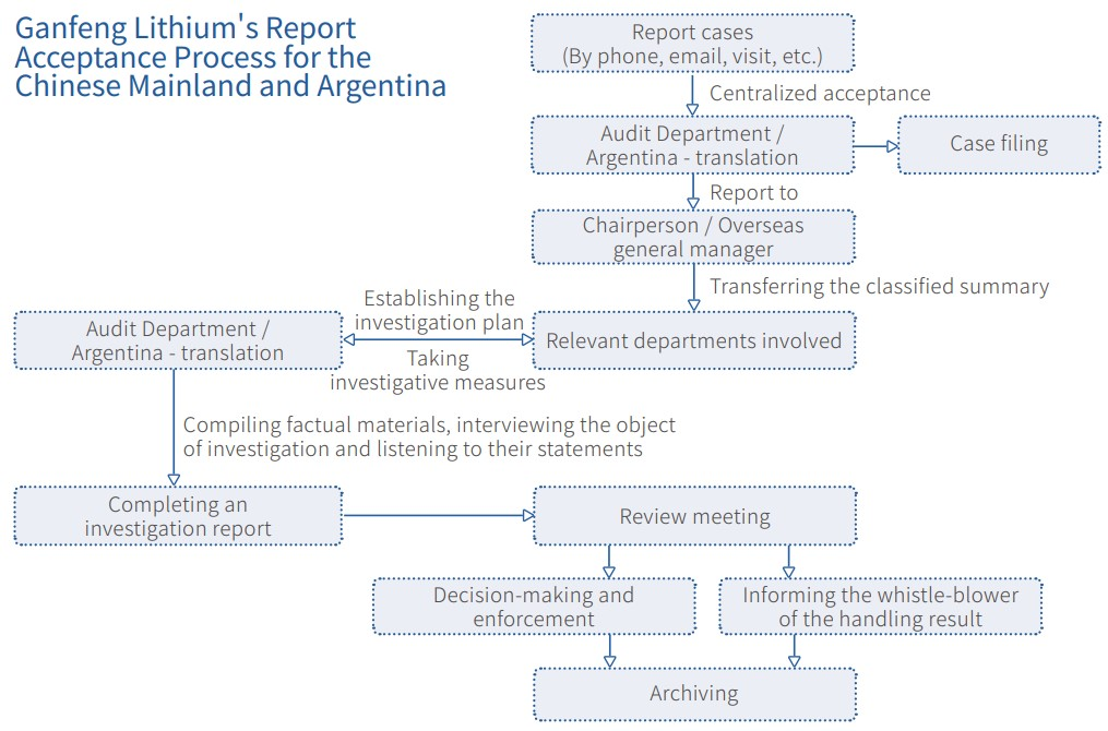In 2021, Ganfeng Lithium launched a targeted and all-out anti-corruption campaign. Ganfeng Lithium adopted a "zerotolerance" approach to corruption by introducing the Management Regulations for Anti-bribery, Anti-Corruption, Anti-fraud and Reporting, the Administrative Measures for Bidding, Negotiated Tendering and Contract Review, the Management Regulations for Anti-Money Laundering and Anti-Terrorist Financing, and the Management Regulations for Employee Integrity and Self-discipline. It was a decisive anti-corruption battle. We kept to the strategy of anti-corruption starting from the inside in 2021. We developed channels for internal complaints and reporting based on earlier anticorruption achievements, drew more attention and worries, raised the exposure of the issues, and collected anticorruption data on a continual basis. For the first time, we pushed the anti-corruption cause outward by sending/pushing A Letter to Ganfeng Lithium's Good Partners to our suppliers, contractors, and other partners, creating a new model of anti-corruption that features cooperation and joint effects with external suppliers. The Audit Department handled a variety of complaints and reports efficiently, as well as investigated and penalized infractions thanks to these thorough internal and external methods. One by one, issues were solved, and Ganfeng Lithium's better ecology was built.